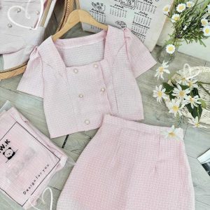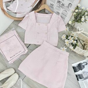 Set dạ hồng nút ngọc + chân váy