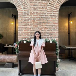 Đầm suông hồng cổ sen tay bồng